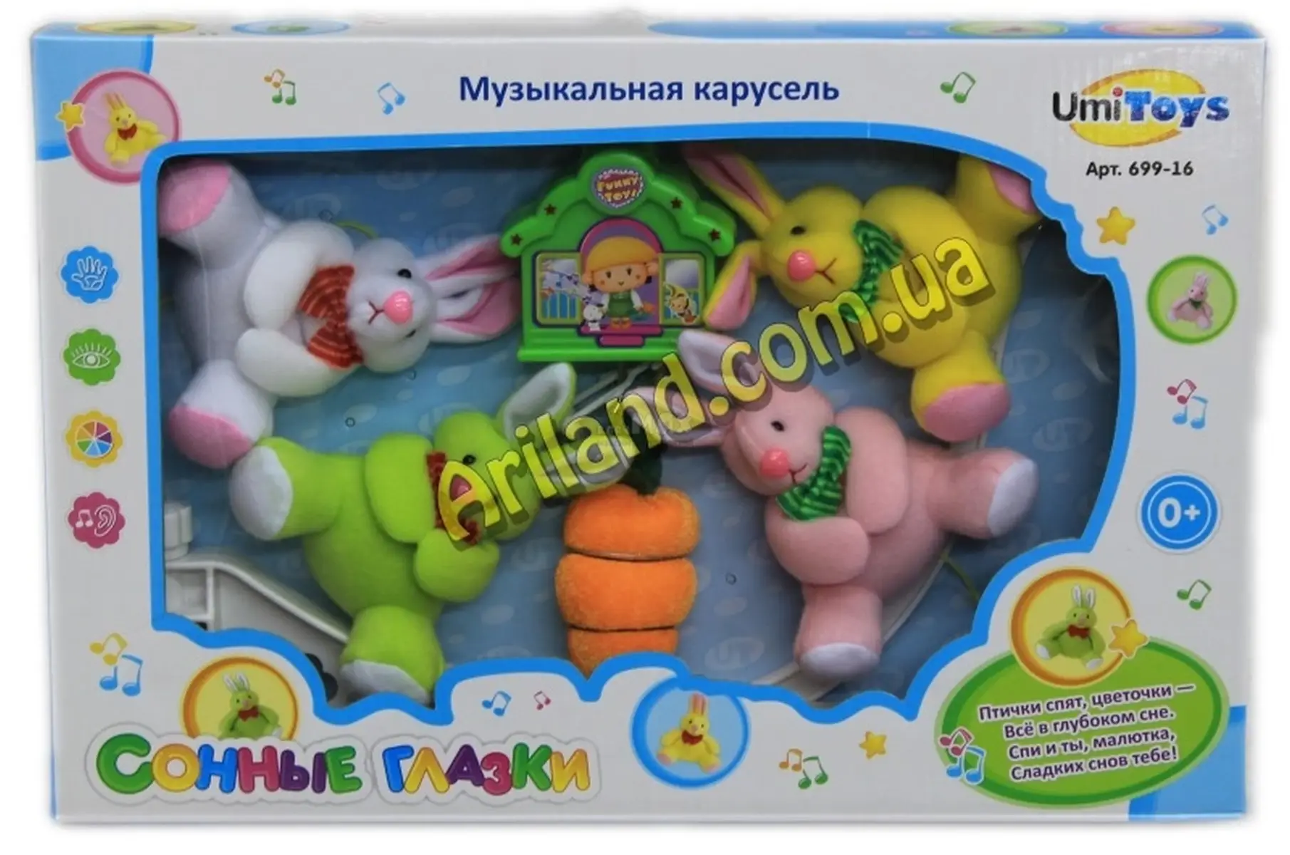 Музыкальная карусель «Сонные глазки» ТМ «Metr+» станет незаменимым помощником в укладывании малыша. ТМ «Metr+» хорошо зарекомендовала себя на рынке детских товаров как производитель качественных, и в то же время недорогих детских товаров. Мобиль имеет универсальный зажим, который позволяет прикрепить его к детской кроватке на безопасном расстоянии. Работает карусель без батареек: достаточно просто завести механического мишку и мобиль начинает вращаться. В набор входят 4 разноцветных зайчика и оранжевая морковка. С музыкальной каруселью «Сонные глазки» вы можете превратить обычное укладывание малыша в игру: включите фантазию и придумайте забавную сказку о зайчатах, ведь уже с первых дней жизни ребенок очень восприимчив к голосу близких ему людей.