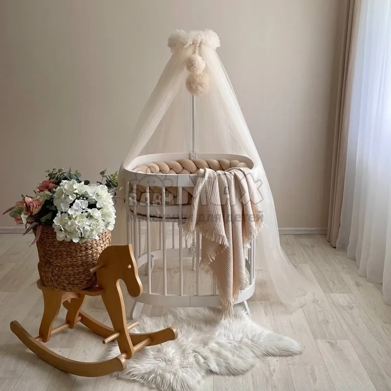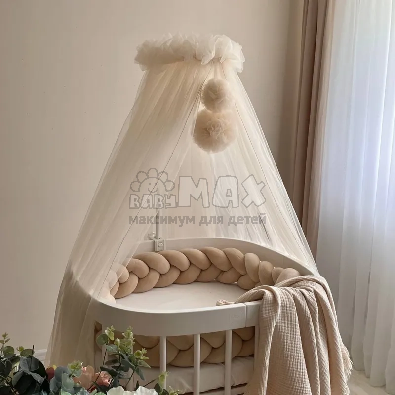Балдахин универсальный подойдет как для стандартной прямоугольной кроватки и круглой/овальной.