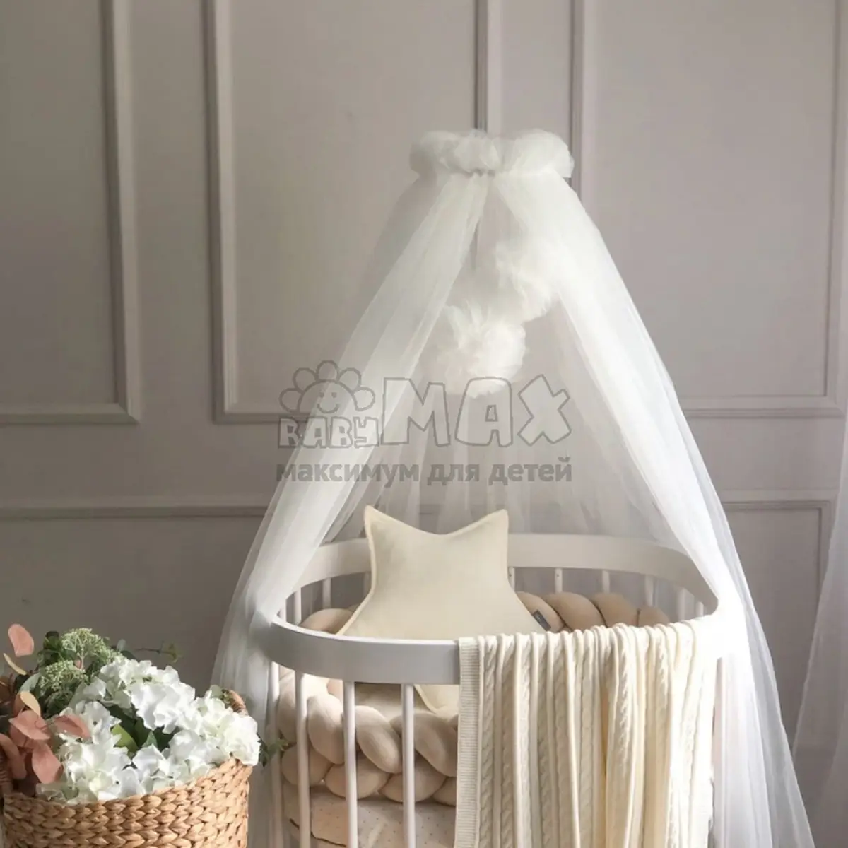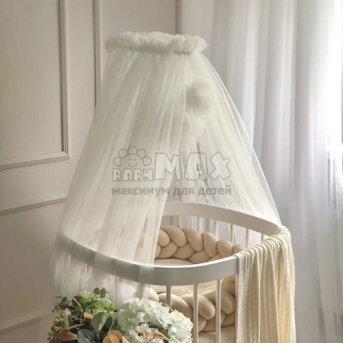 Балдахин универсальный подойдет как для стандартной прямоугольной кроватки и круглой/овальной.
