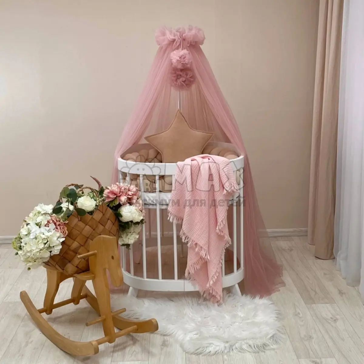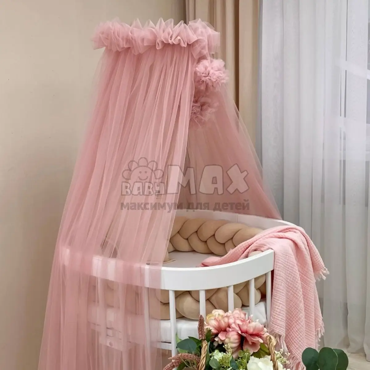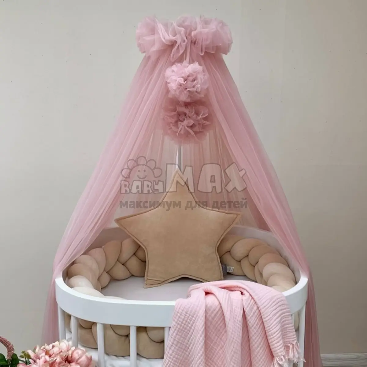 Балдахин универсальный подойдет как для стандартной прямоугольной кроватки и круглой/овальной.