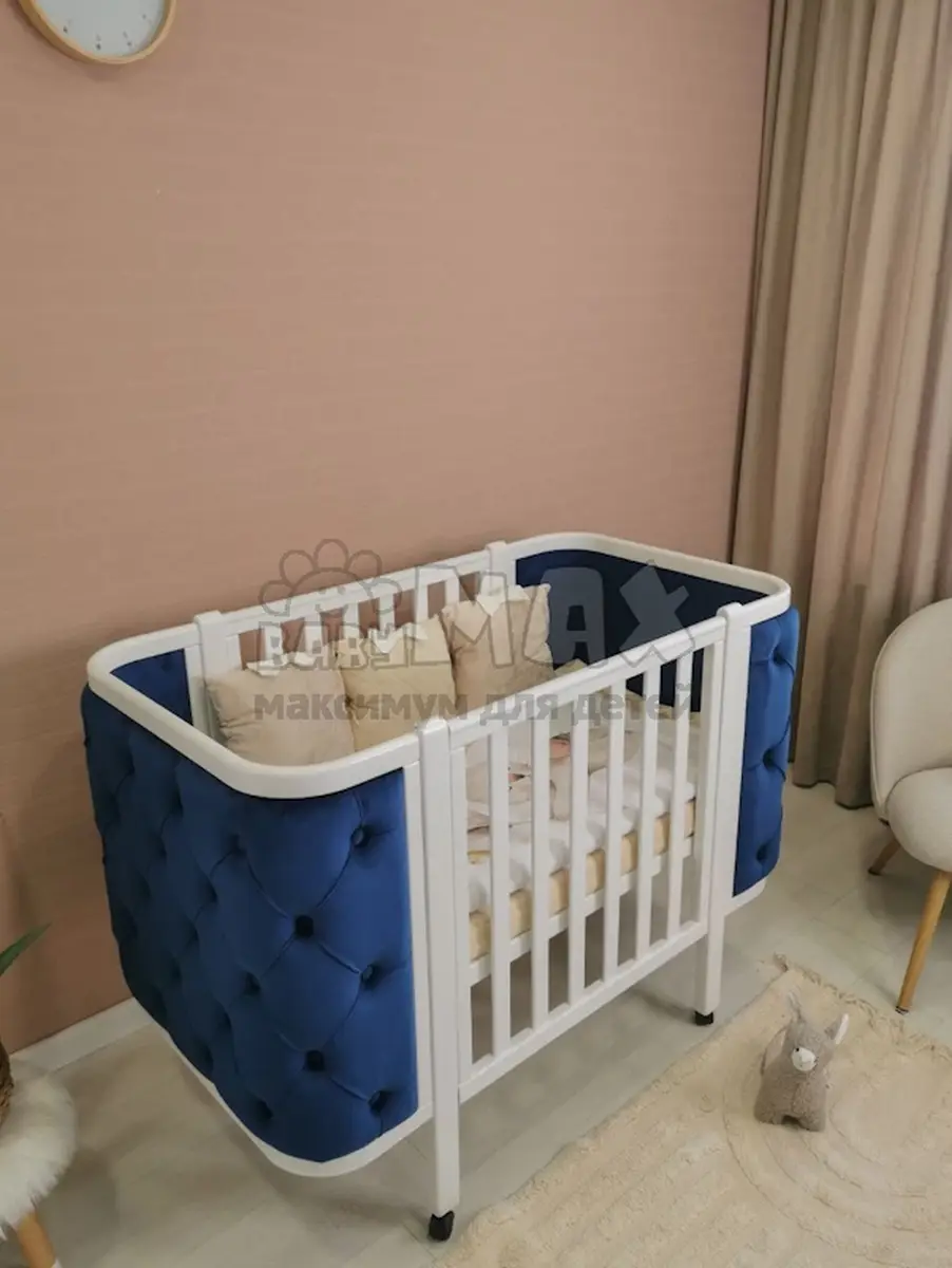 Модель абсолютно безопасная для новорожденных малышей. В качестве основного материала используется дерево (бук + ольха), они не вызывают у малыша проблем со здоровьем. В качестве покрытия используется краска на водной основе. Бока кроватки закруглены и дополнены мягкой оббивкой из велюра.