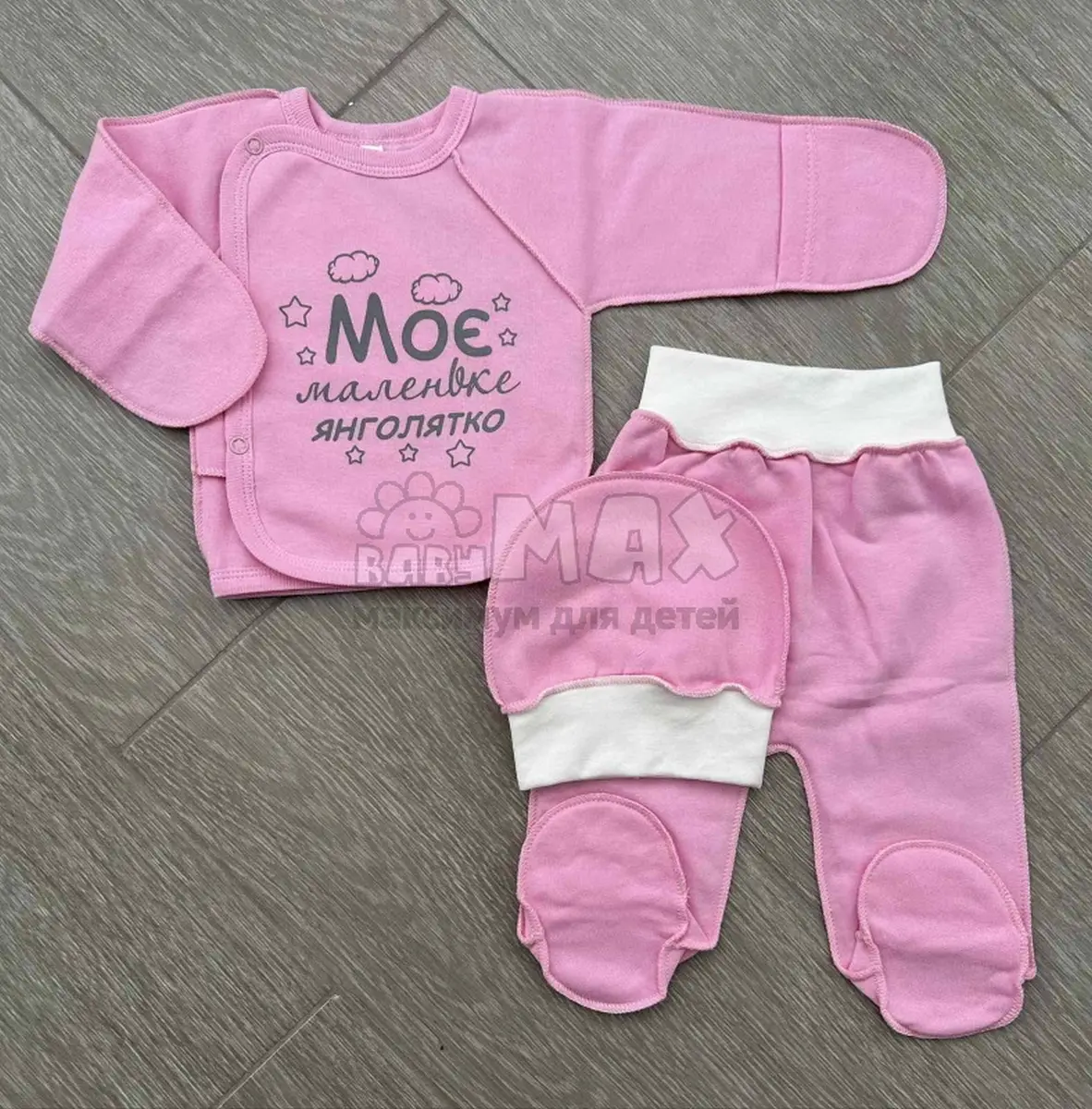 - Комплект: шапочка + распашонка + ползунки