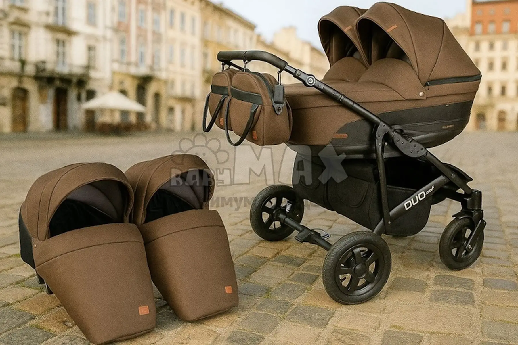 Коричневая универсальная коляска для двойни Angelina Respect Duo.