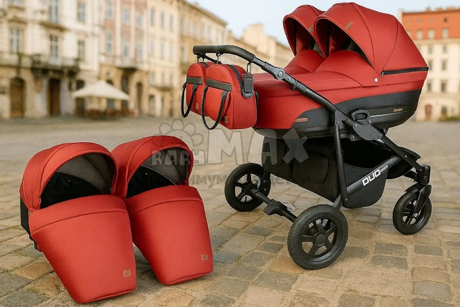 Красная универсальная коляска для двойни Angelina Respect Duo.