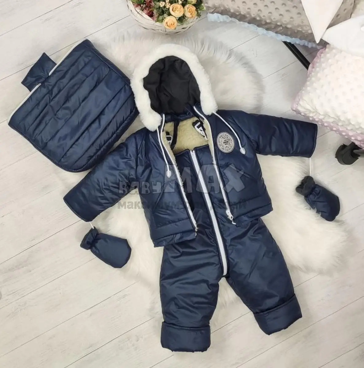 Изделие включает в себя 3 части: курточку с перчатками, комбинезон открытые ножки и накидка на ножки, которая превращает комбинезон в конверт с закрытыми ножками.
