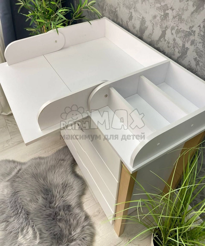 Комод пеленальный изготовлен из ДСП. Верхняя плоскость приспособлена для размещения пеленального матраса, что обеспечивает удобный и безопасный доступ к ребенку во время ухода. Телескопические направляющие способствуют легкому пользованию ящиками.