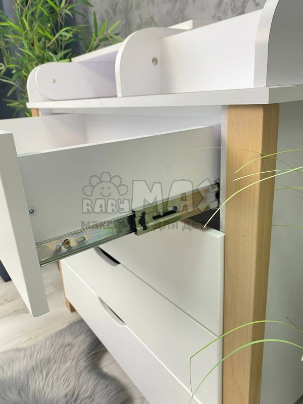 Белый и натуральный цвет позволяют гармонично вписать комод в современный или классический интерьер. Благодаря телескопическим направляющим и вместительным ящикам, пеленальный комод практичный для ежедневного использования.