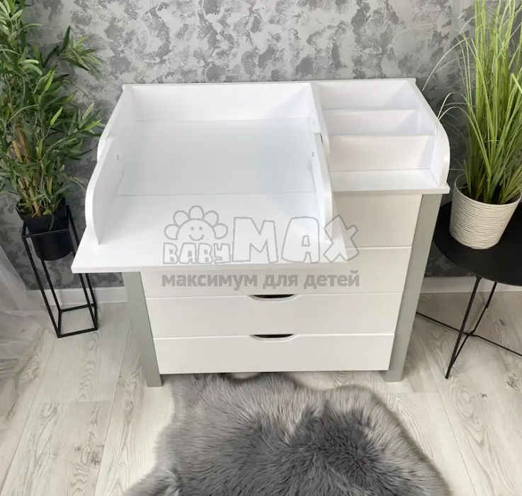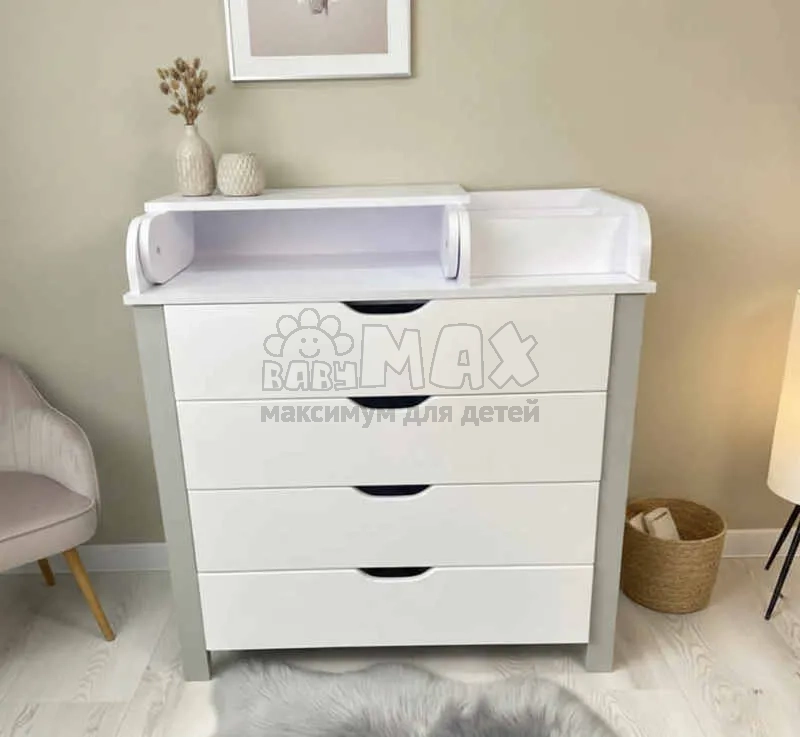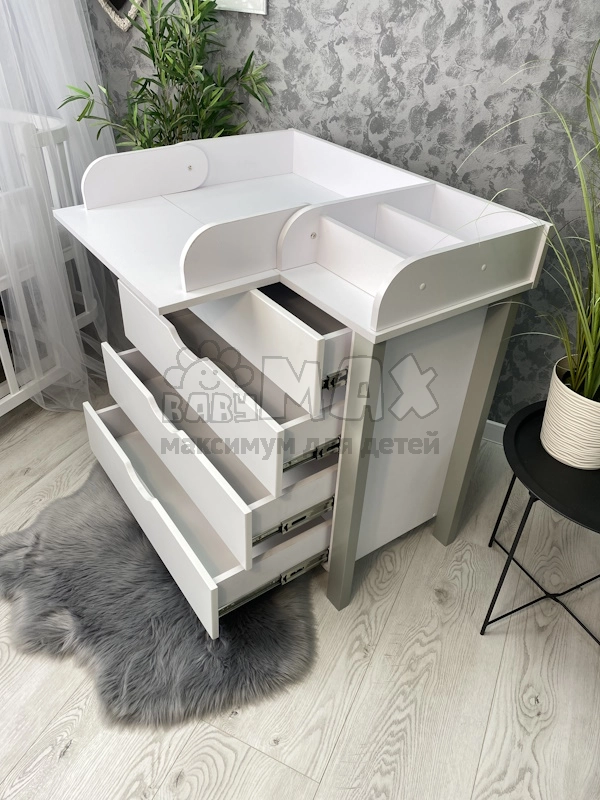 Комод изготовлен из ДСП, что обеспечивает прочность и стабильность изделия. Телескопические направляющие делают использование ящиков легким и плавным. Верхняя плоскость приспособлена для пеленального матраса и обеспечивает удобный доступ к ребенку во время ухода.