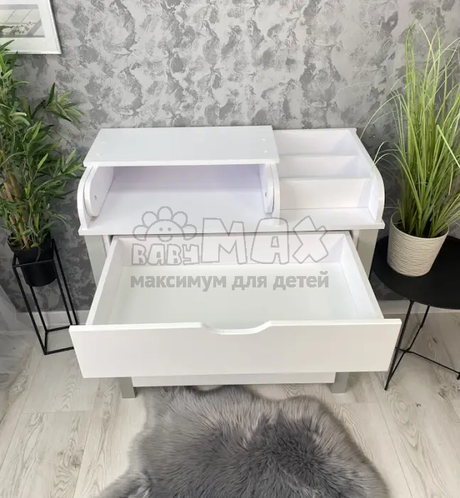 Пеленальный комод 900 мм — стационарная мебельная модель из материала ДСП для детской комнаты. Комод оснащен телескопическими направляющими для плавного открывания ящиков и плоской поверхностью сверху для комфортной процедуры пеленания.