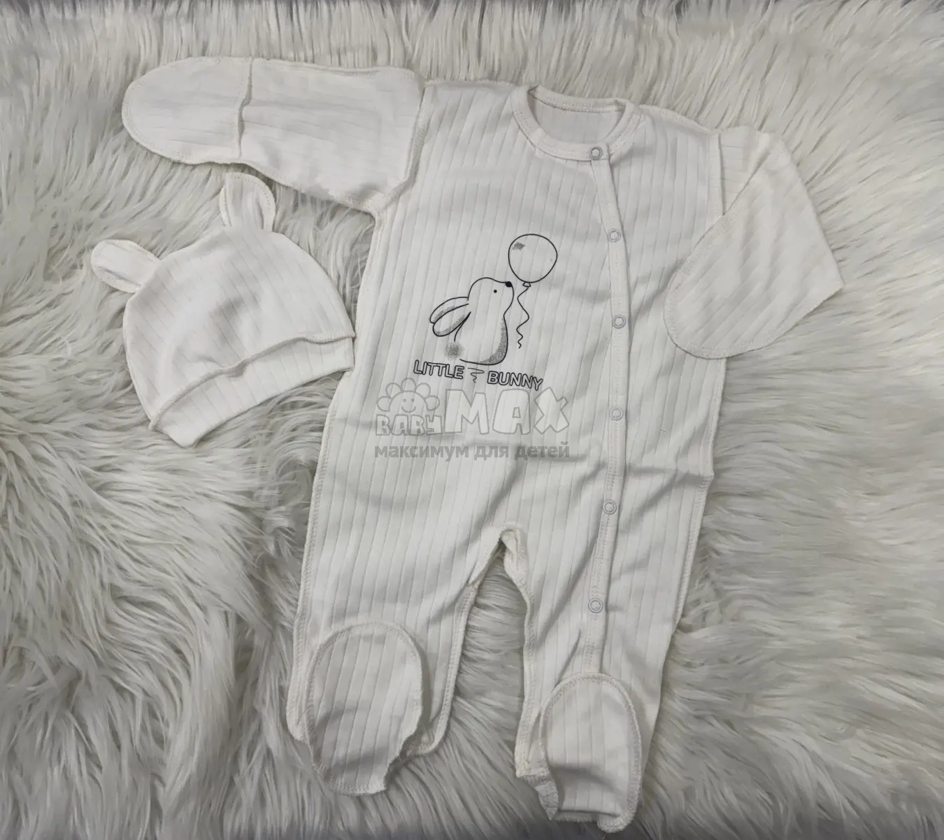 Представленный костюмчик станет отличным выбором для малышей, так как не сковывает движение ребенка и позволяет ему свободно двигаться. Он включает в себя такие атрибуты: распашонка, штанишки и шапочка. Распашонка украшена ушками и мордочкой зайчика на животике. Ручки малыша в безопасности, так как они закрыты при помощи царапок. Закрывается кофточка на кнопочку, с запахом. Штанишки с закрытыми при помощи носочков ножками, не передавливают живот малыша. Шапочка с завязками сможет закрыть ушки малыша.