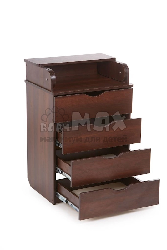 Комод оснащен 4 шухлядками на телескопических направляющих. Также в комплектацию входит специальный ремень, который возможно зафиксировать к стене для во избежания перекидывания.