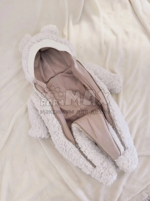 Спальник выполнен с капюшоном с ушками. Комбинезон так же выполнен с капюшоном, легко открывается справа и лева при помощи молнии.