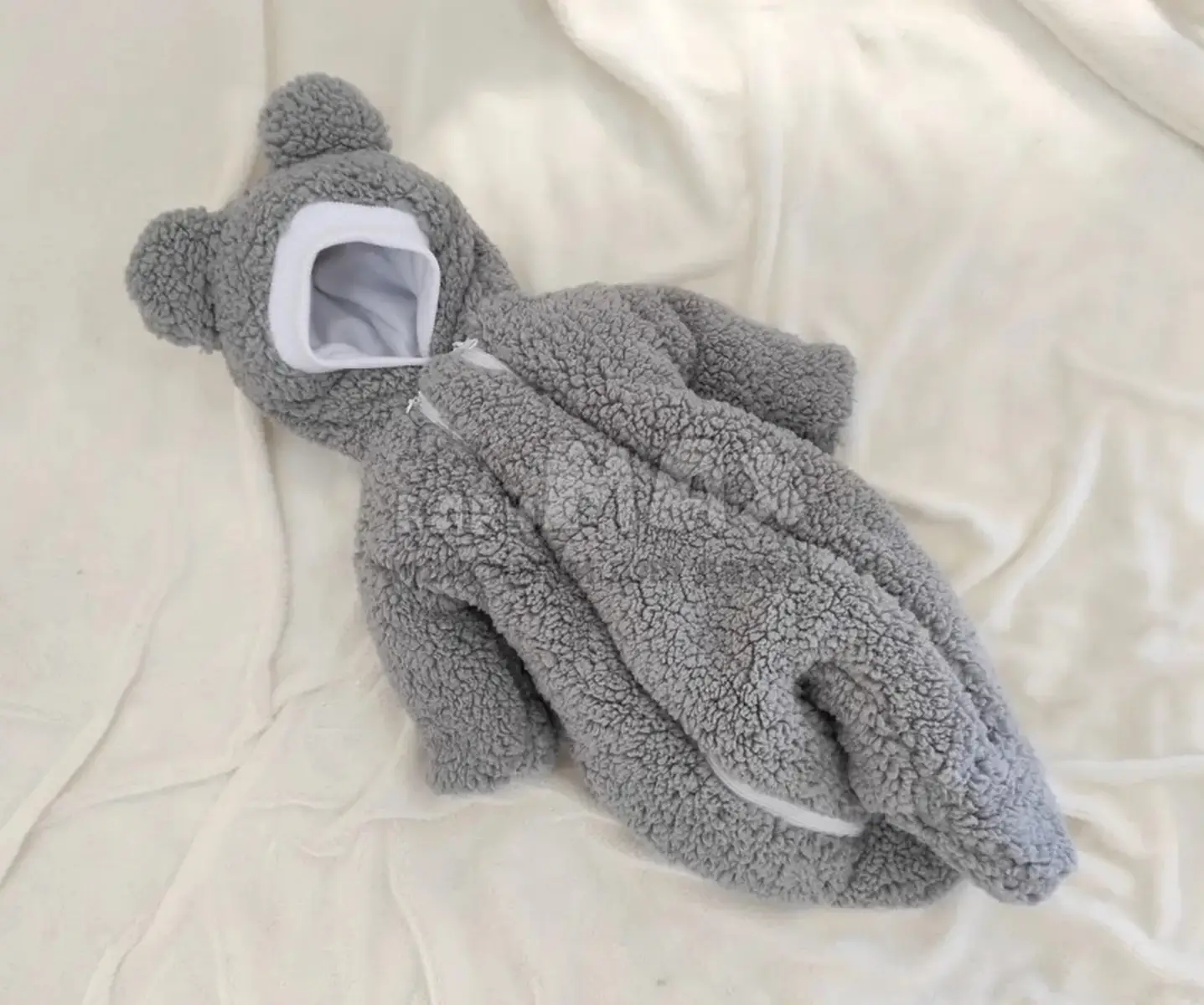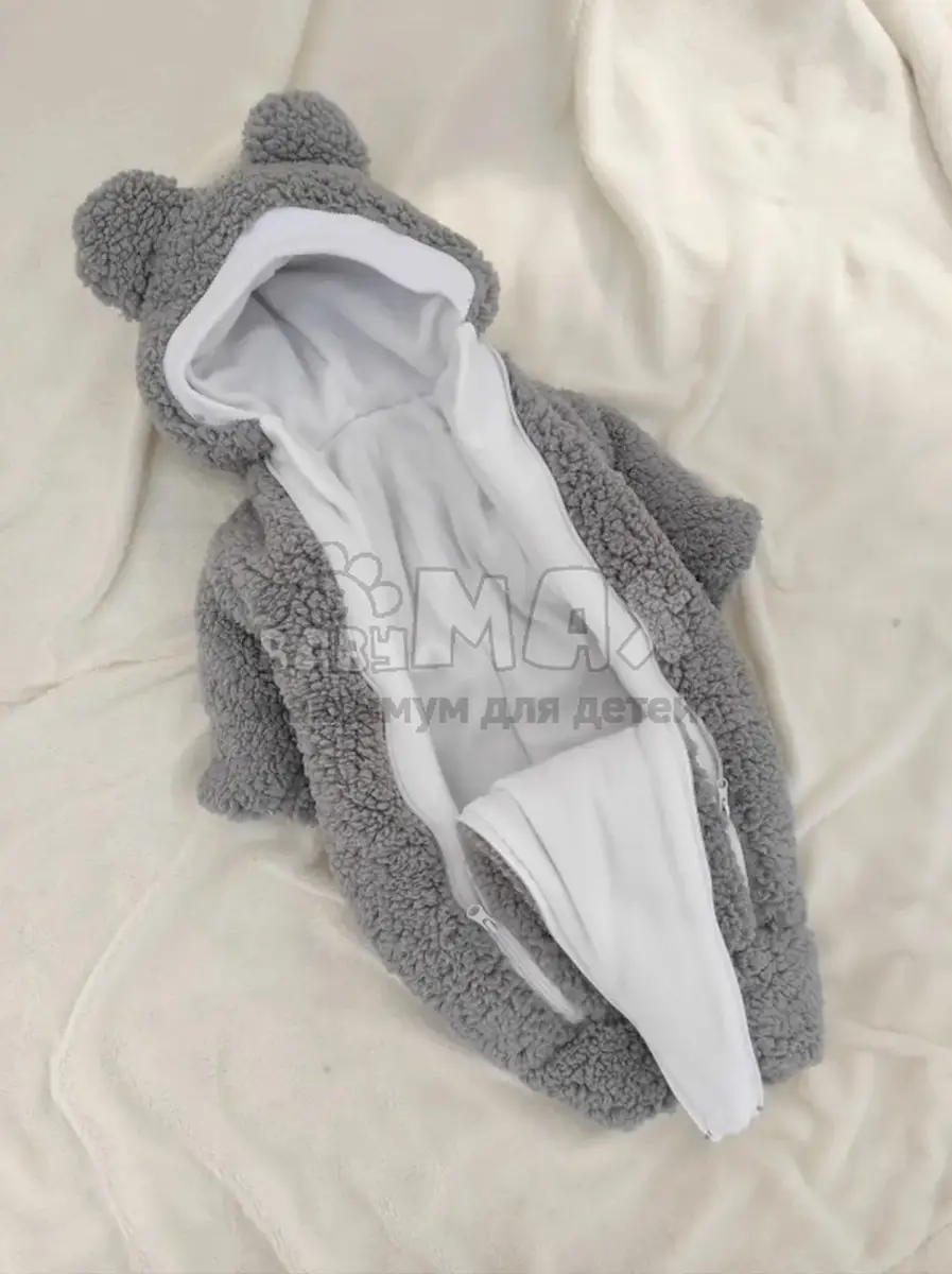 Спальник выполнен с капюшоном с ушками. Комбинезон так же выполнен с капюшоном, легко открывается справа и лева при помощи молнии.