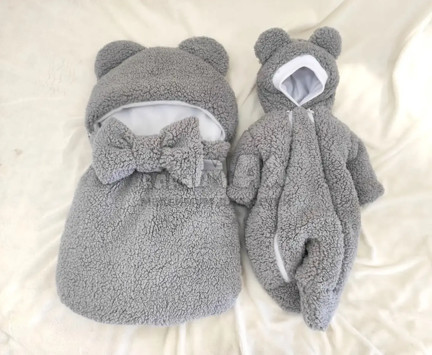 Выполнен комплект из натурального, безопасного материала который не вызывает аллергические реакции на теле ребенка — мех «тедди».