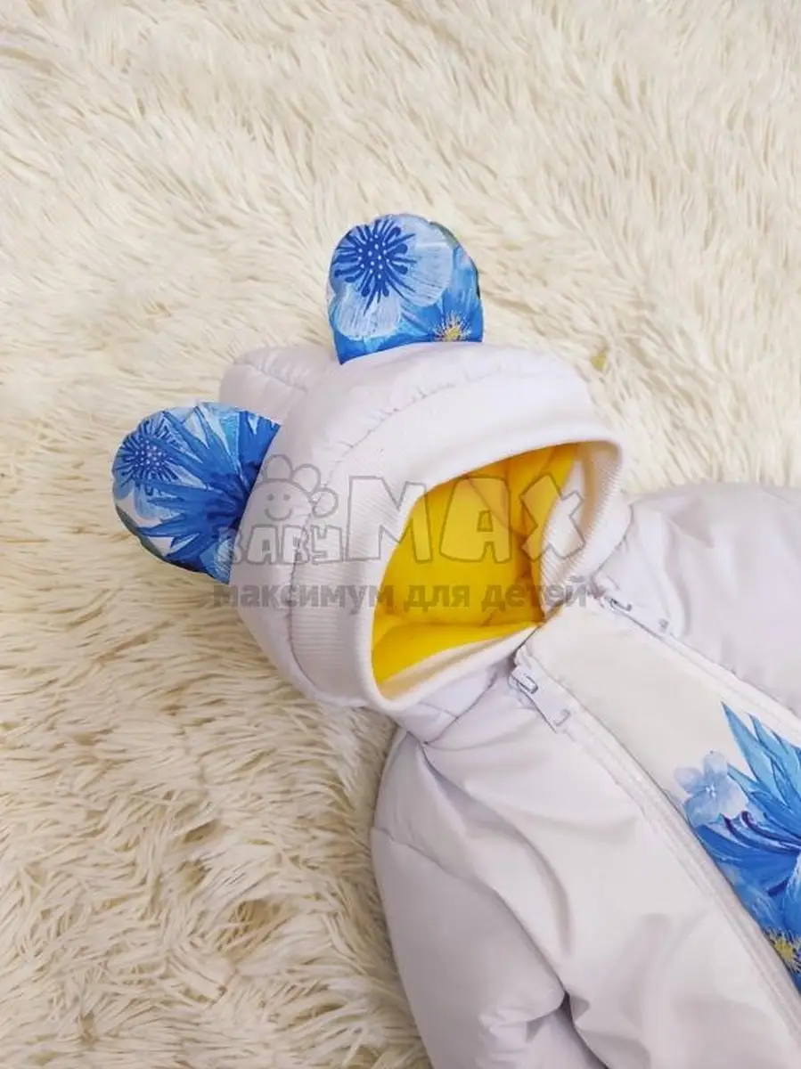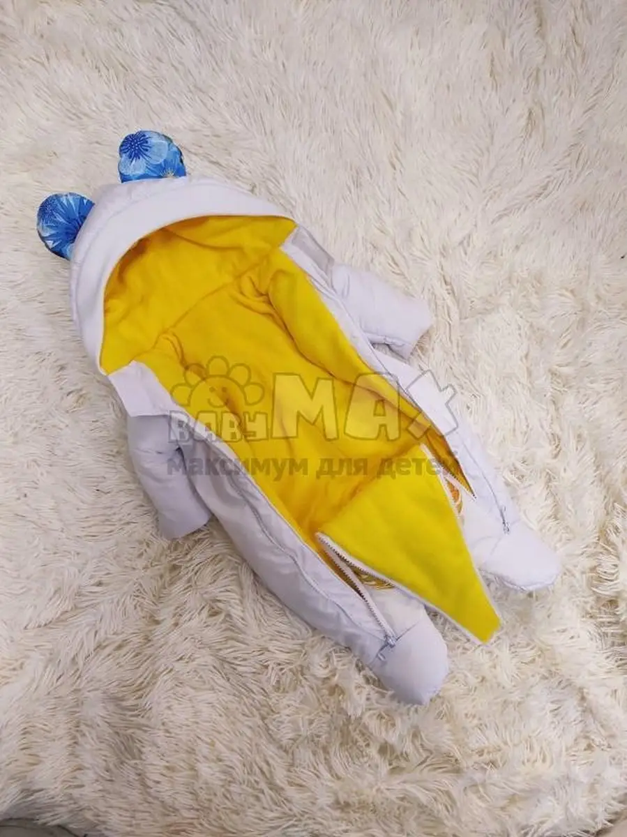 В средине – флисовая подкладка, которая согреет ребенка. Также комплект утеплен при помощи – синтепон 300. Ручки и ножки крохи – закрыты, и выполнены анатомически правильной форме. Комбинезон и слип удобно открывается при помощи молнии. От ветра малыша защитит глубокий капюшон, который выполнен из рибаны. В районе шеи младенца изделие закрывается на липучку. В качестве декоративного элемента – маленькие ушки.