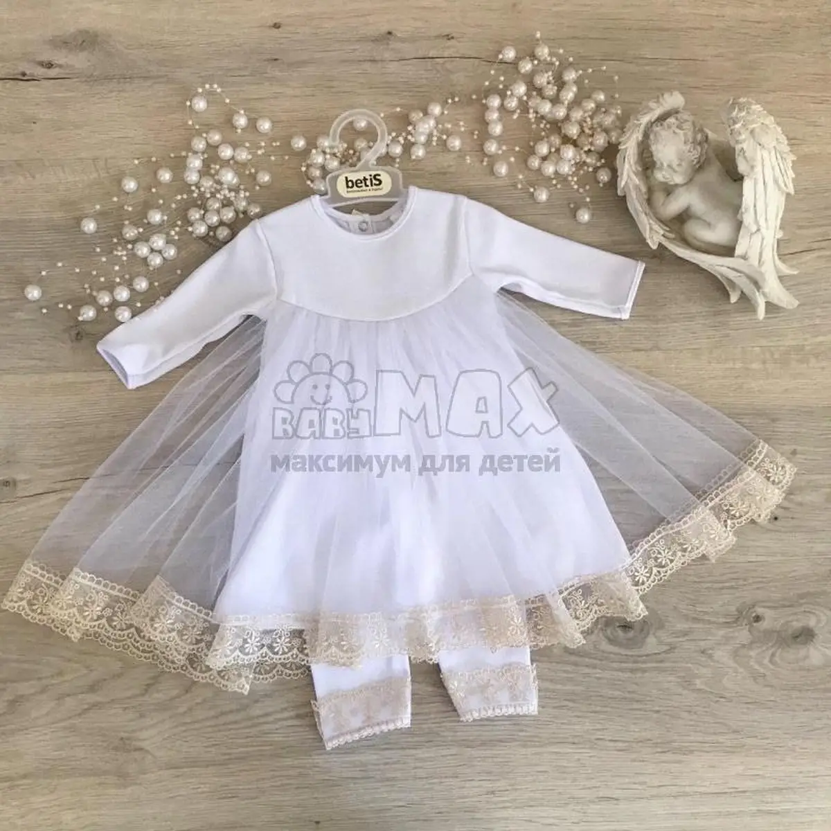 Betis – это украинский бренд который специализируется на создании нарядной одежды для новорожденных малышей. Данный комплект выполнен в белом цвете и декора в молочном оттенке. Ручки и ножки малыша – открытые. Юбка выполнена из фатина и украшена рюшами на краях. Платье выполнено в размере – 56 см(18р). В интернет магазине Бебимакс, Вы также сможете найти большой ассортимент нарядной одежды для малышей от бренда Бетис.