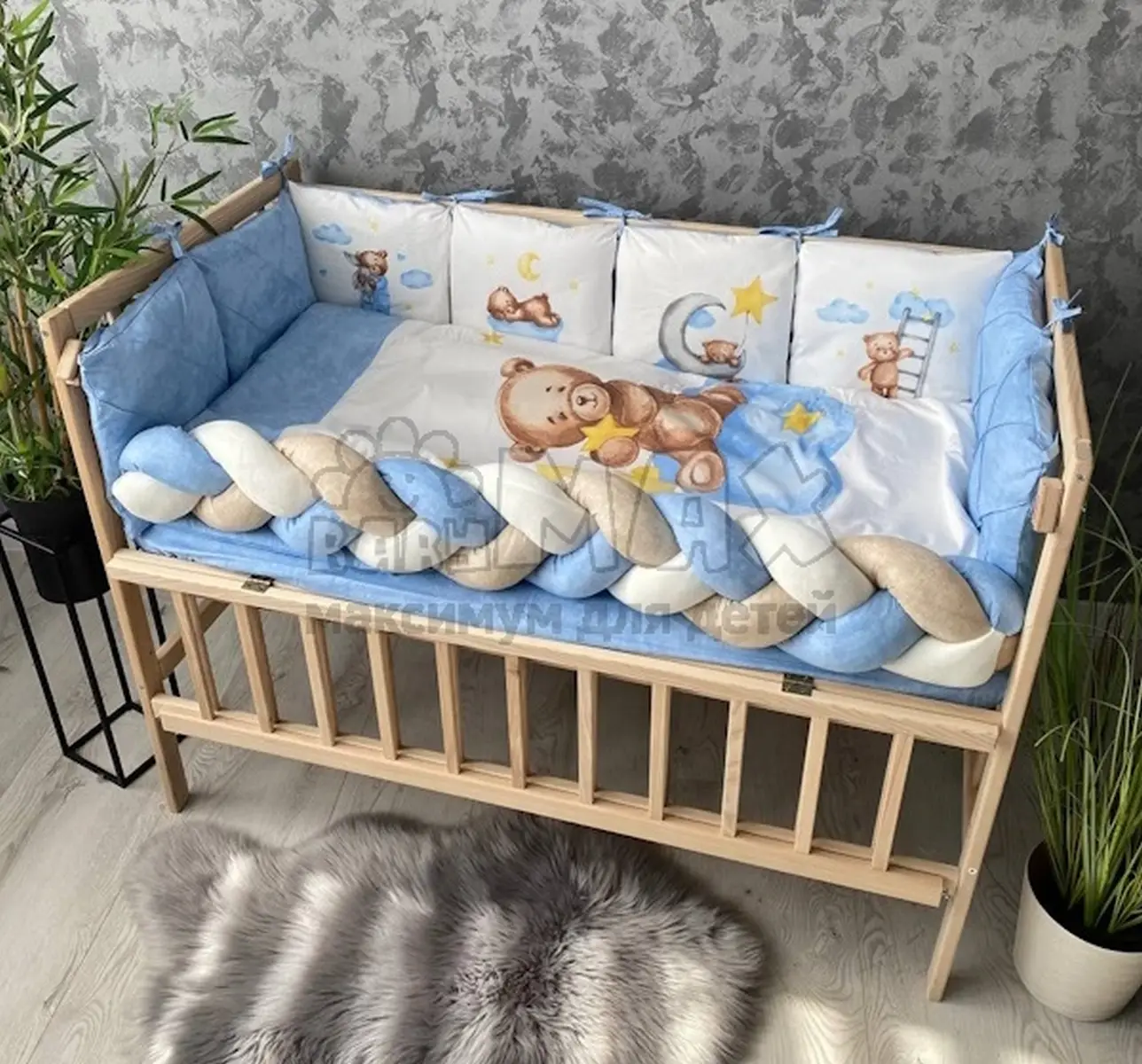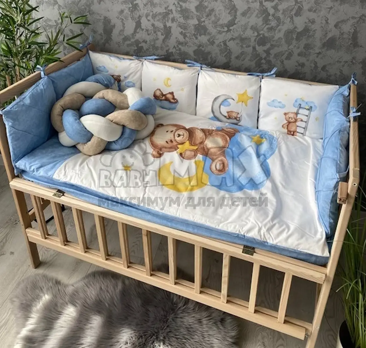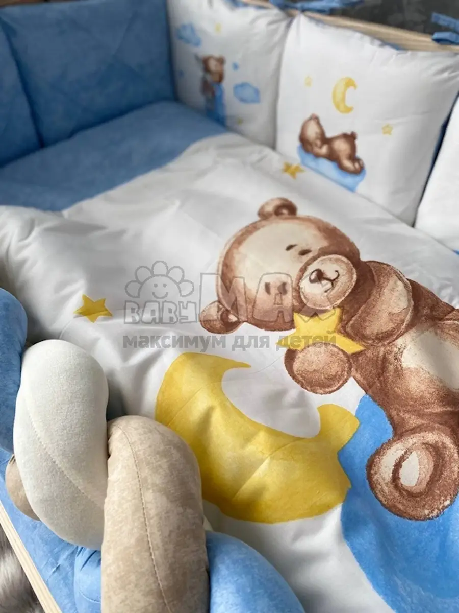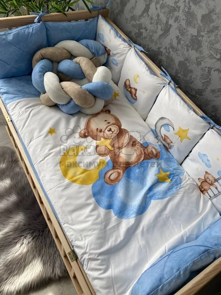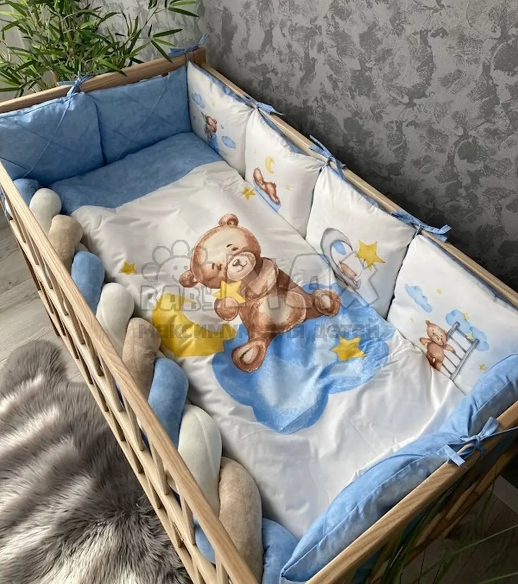 Универсальный размер позволяет использовать комплект в любой детской кроватке: прямоугольной, овальной или круглой.