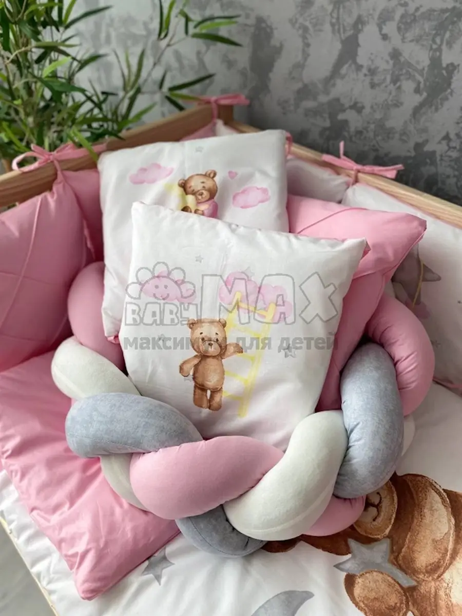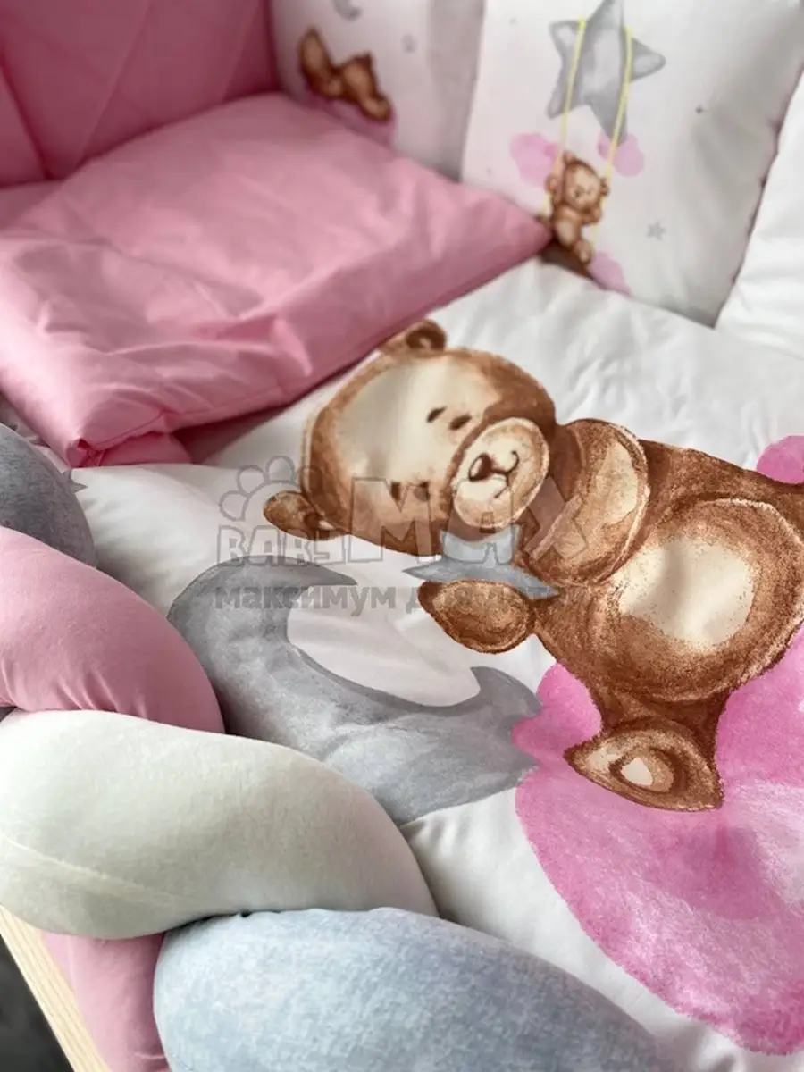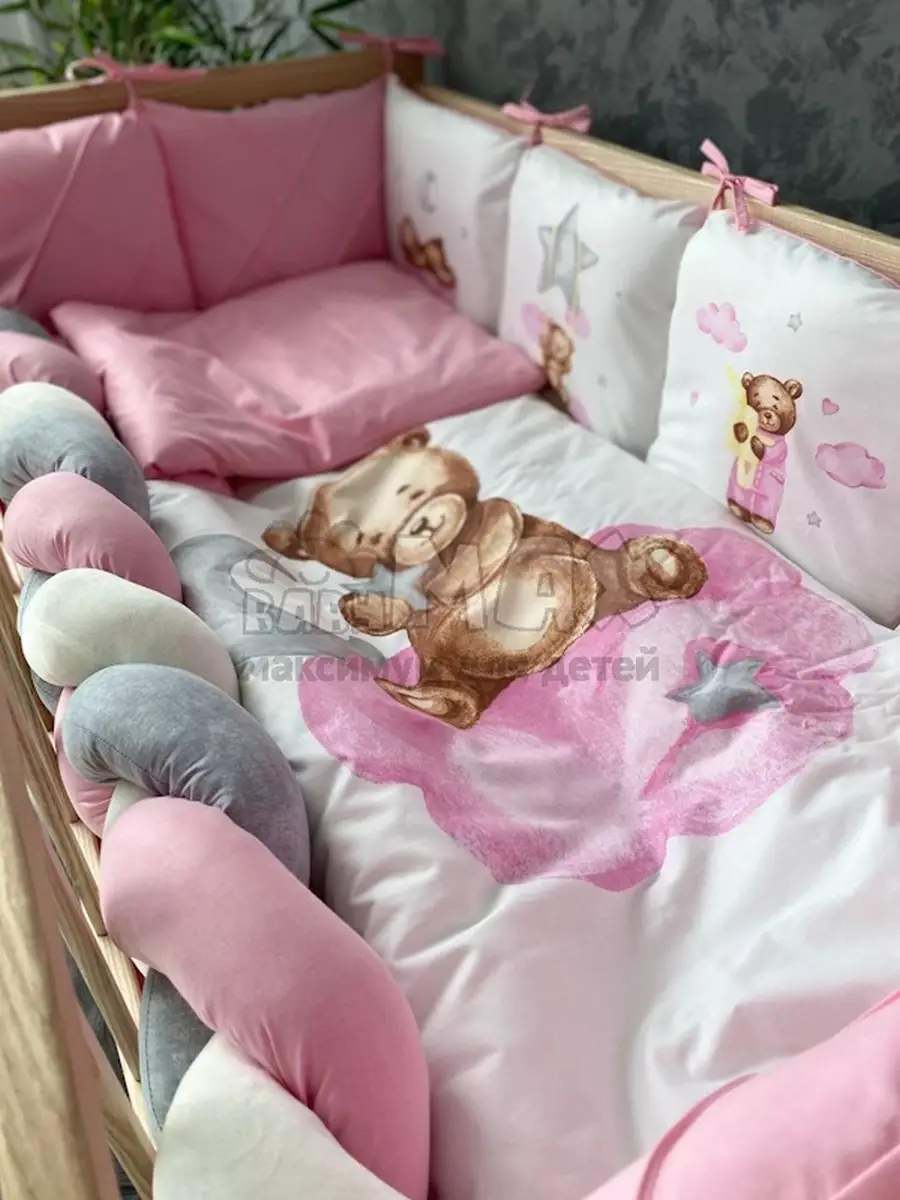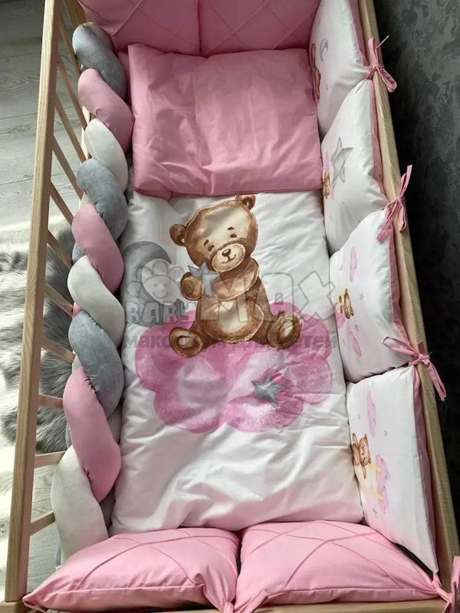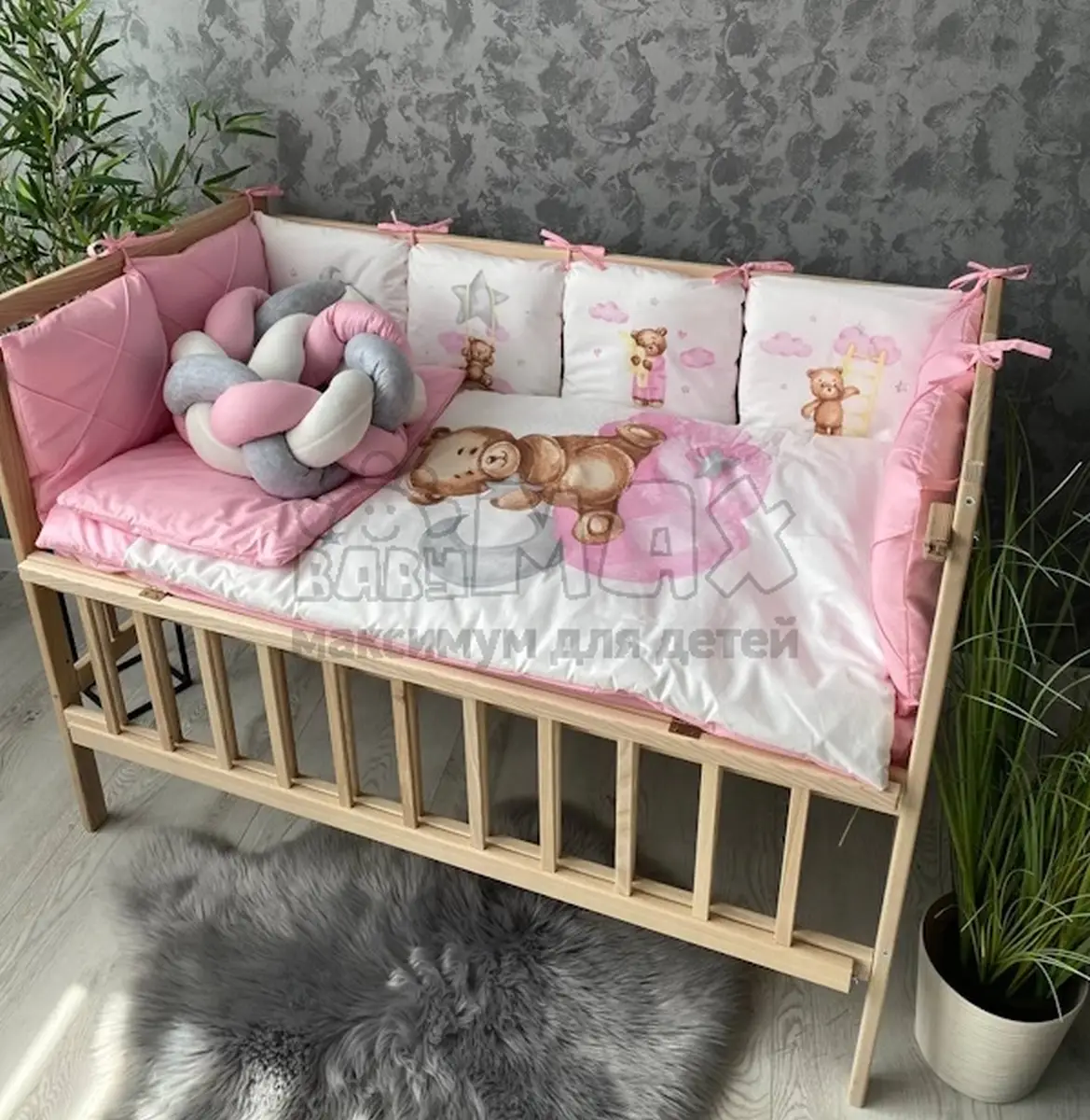 Комплект подойдет для любой кроватки: прямоугольной (120х60 см), овальной и круглой.
