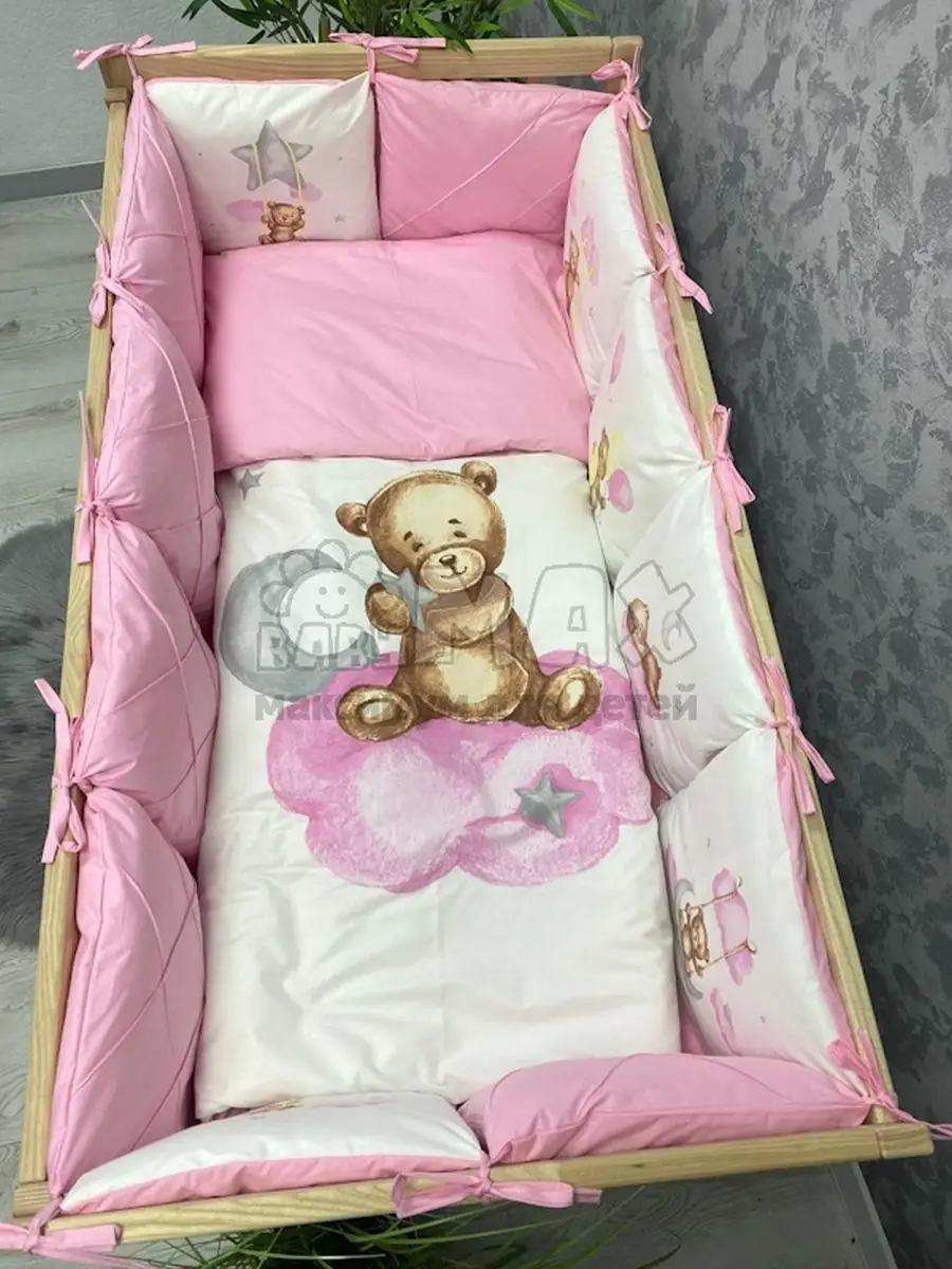 Комплект подойдет для любой кроватки: прямоугольной (120х60 см), овальной и круглой.