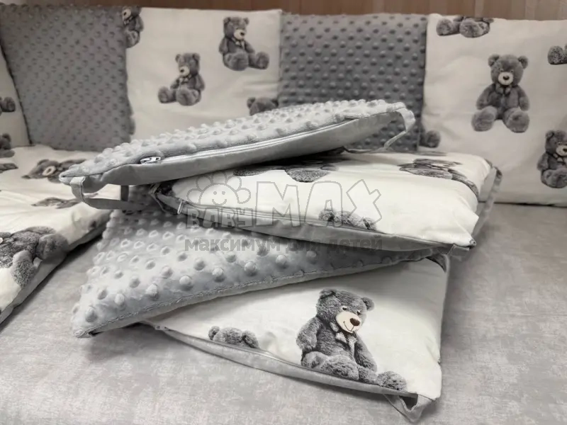 12 мягких бортиков-подушечек на молнии (30х30 см) создают безопасную зону, защищая кроху от случайных ударов.