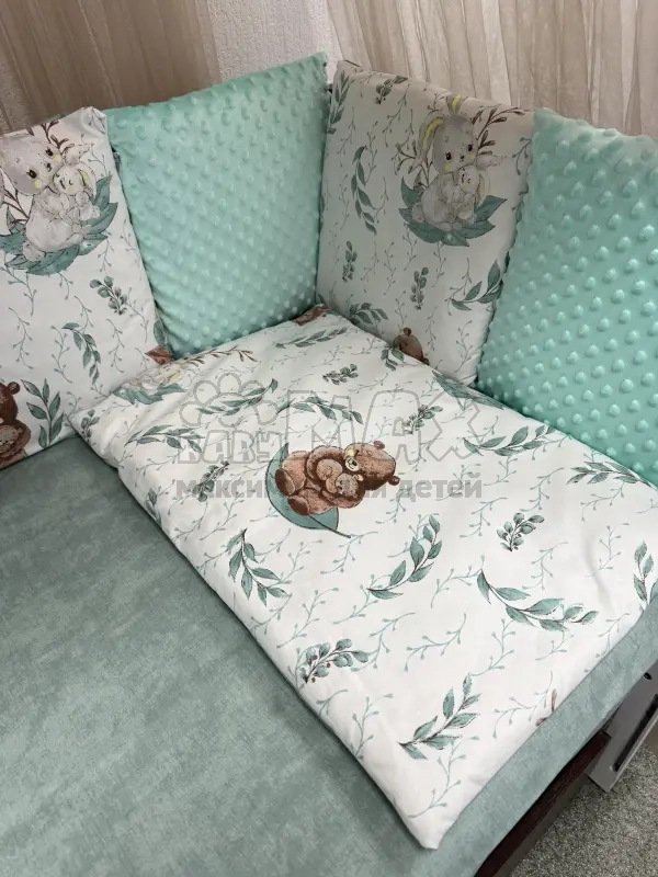 Этот комплект – настоящая находка для заботливых родителей. Он идеально подходит для кроваток любой формы: прямоугольных, овальных и круглых. Мягкий хлопок и нежный плюш подарят вашему малышу ощущение комфорта и безопасности, а качественный наполнитель обеспечит тепло и уют во время сладкого сна.
