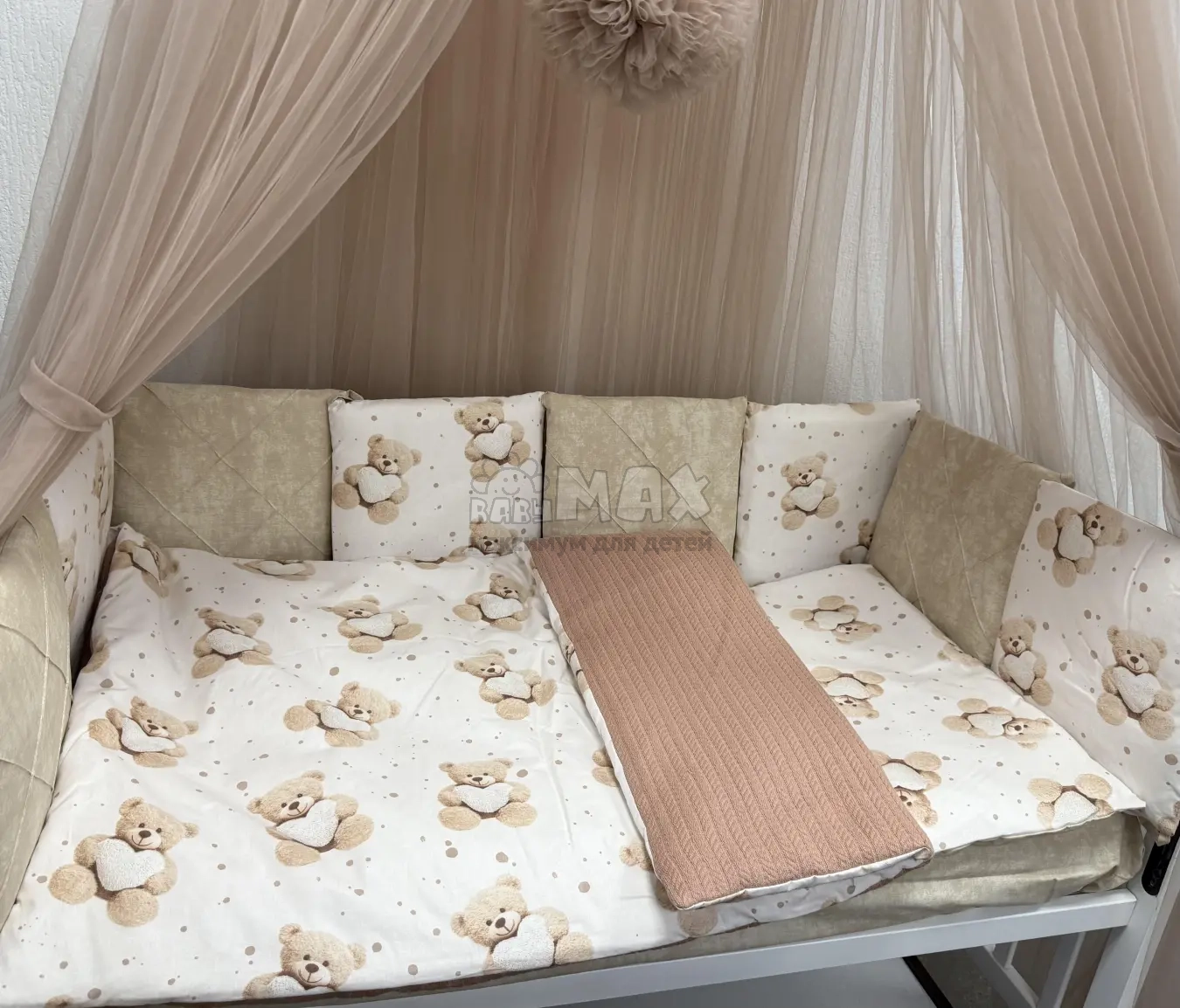 Комфортное и безопасное спальное место для малыша — это не только правильный выбор кроватки и матраса. Также особое внимание стоит обратить на комплект постельного белья. В магазине Babymax представлен широкий выбор комплектов по комплектации, цене и расцветкам. В наличие как комплекты без защитных бортиков и балдахина, так и уютные варианты с балдахином, защитными бортиками и косой. Если Вы в поисках натурального комплекта, который будет нейтральным вариантом как для мальчика так и для девочки, настоятельно рекомендуем обратить внимание на данный комплект.