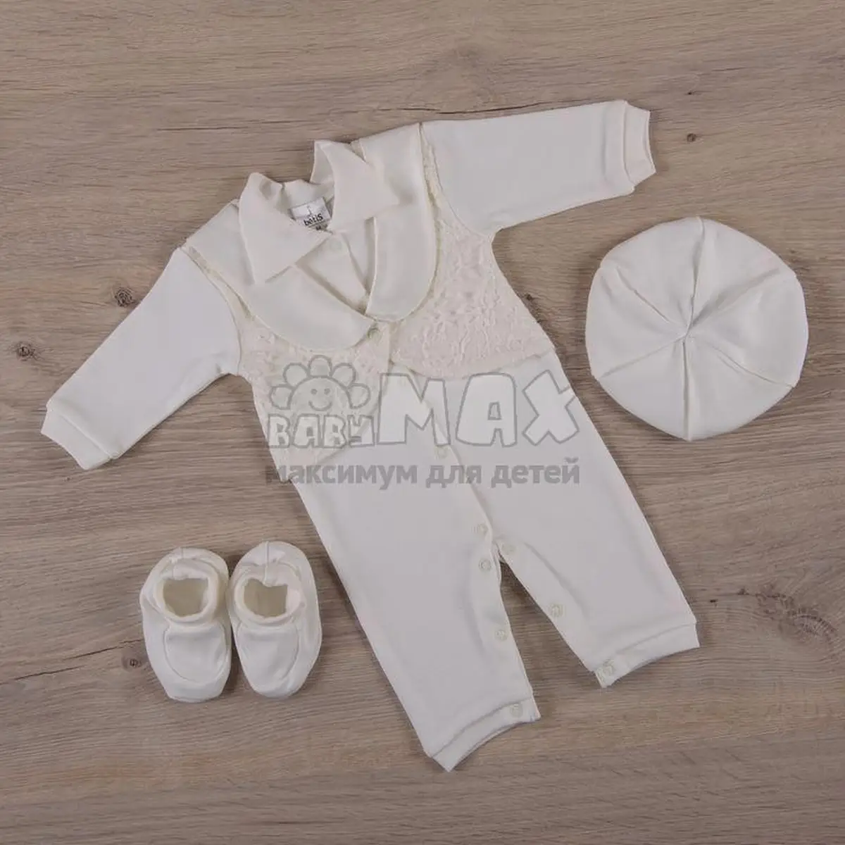 Бетис - один из самых популярный производителей детской одежды для новорожденных малышей. Набор представлен в молочном цвете, в размере 56, 62 см. Комплект для новорожденных включает в себя: пинетки, человечки и шапочка. Человечек дополнен нарядной кружевной жилеточкой. Рукава и ножки - открыты. Пинеточки закроют ножки малыша, и сохранят их в тепле. Шапочка закроет ушки новорожденного малыша от ветра.