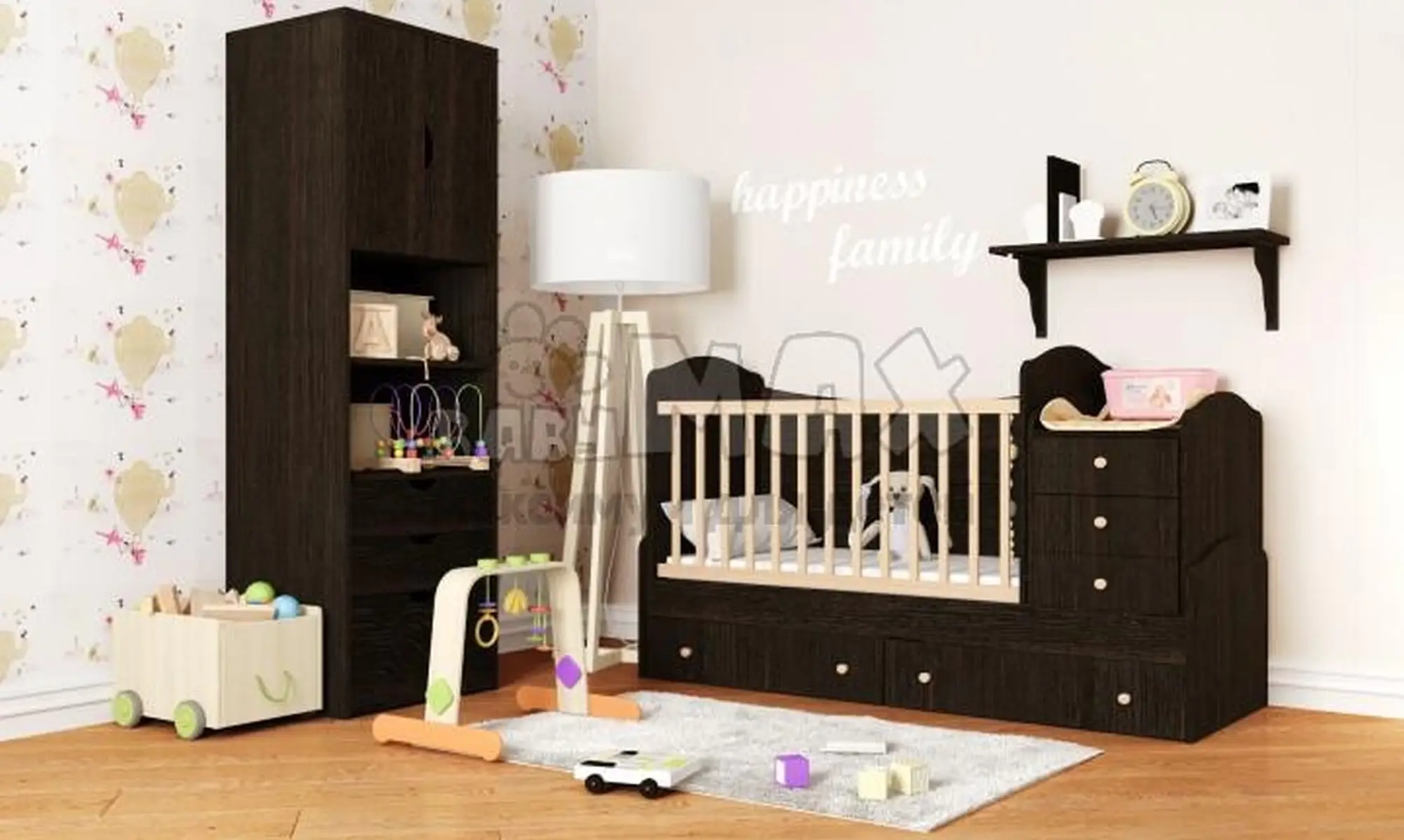 - в комплектацию входит люлька, кроватка, комод;