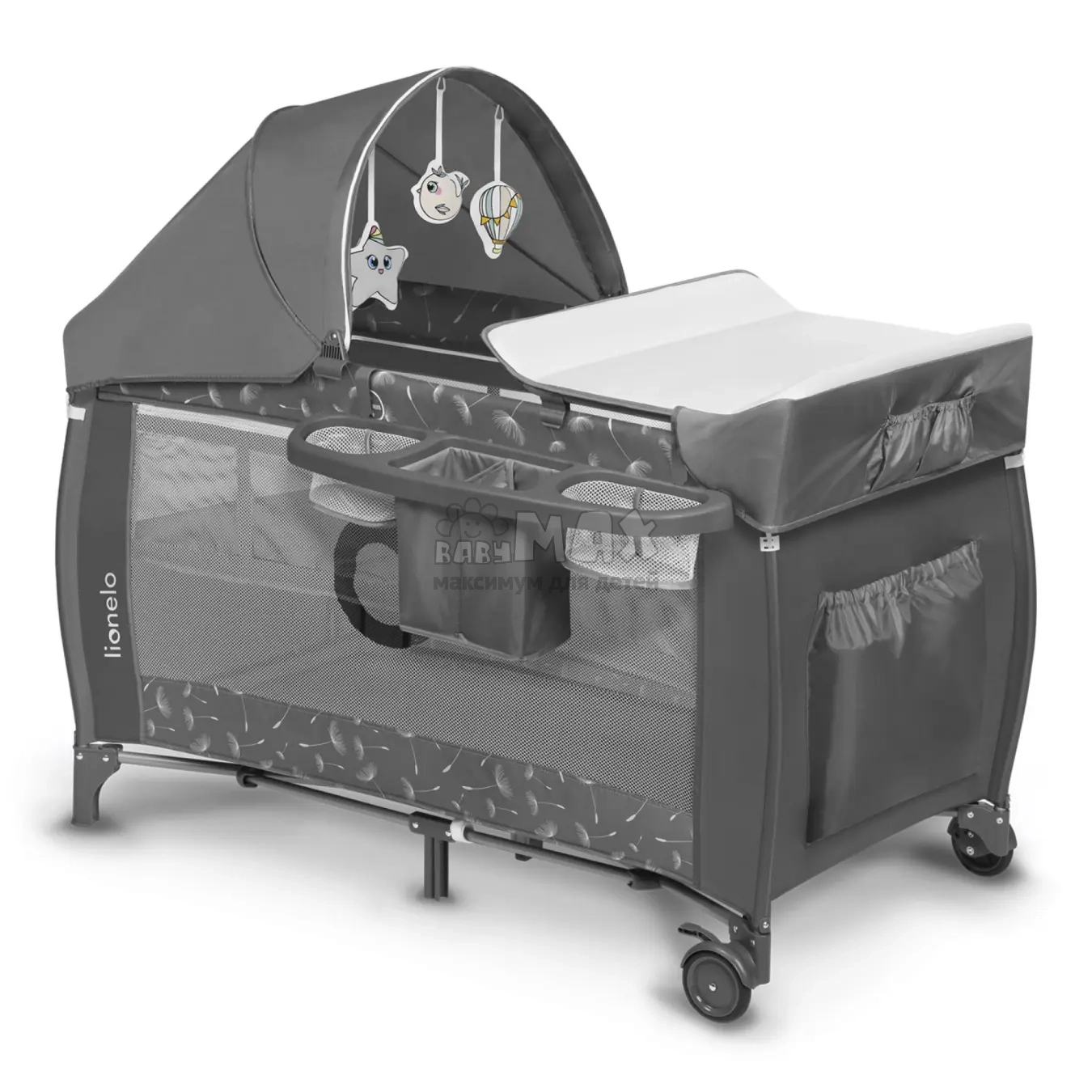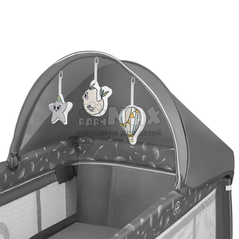 3. В комплекте: матрас, пеленальный столик, органайзер для аксессуаров, балдахин с москитной сеткой и игрушки для подвешивания на балдахин.