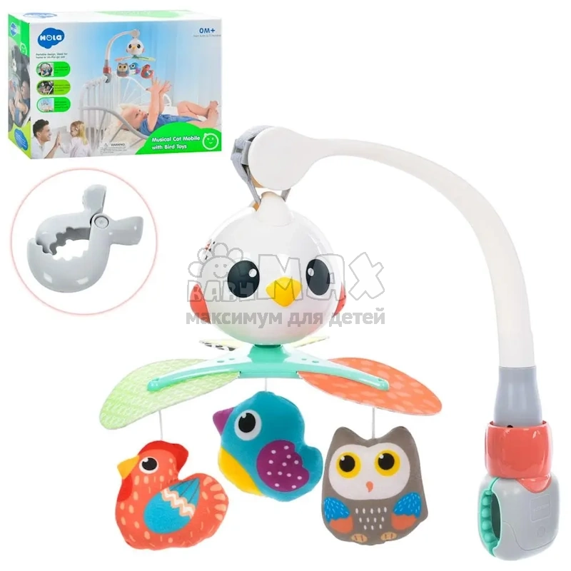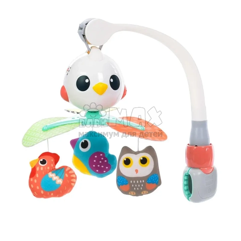 Мобиль оснащен 3 игрушками, которые крутятся на 360 градусов в виде ярких птичек. Также игрушка дополнена 10 успокаивающими игрушками.