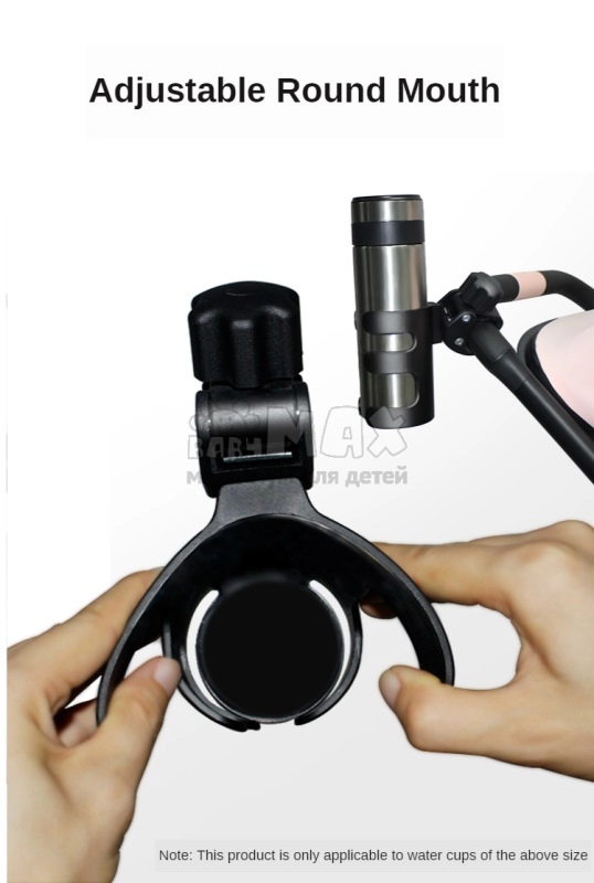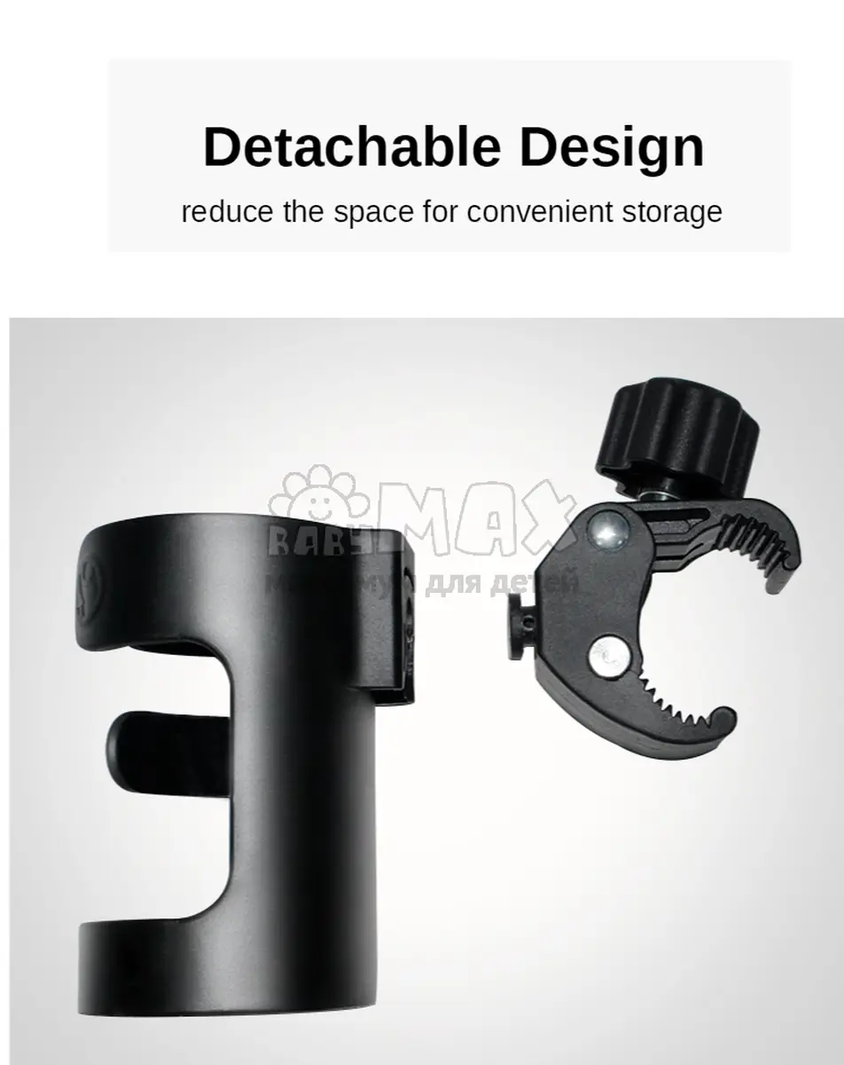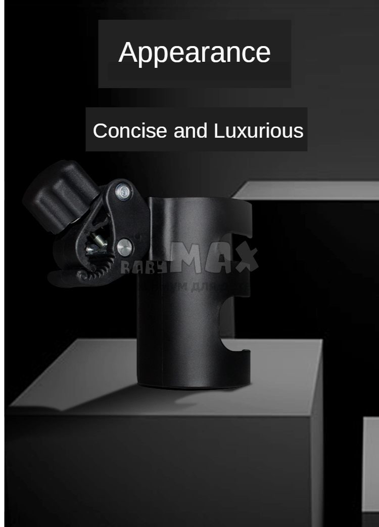 Представленный вариант держателя для напитков, легко снимается и устанавливается. В качестве основного материала используется пластик. Он не токсичен и абсолютно безопасен для здоровья младенца. Крепление легко регулируется, под необходимый объем и вид тары. Подстаканник подойдет как для детской бутылочки, так и для стаканчика с кофе или термокружки.
