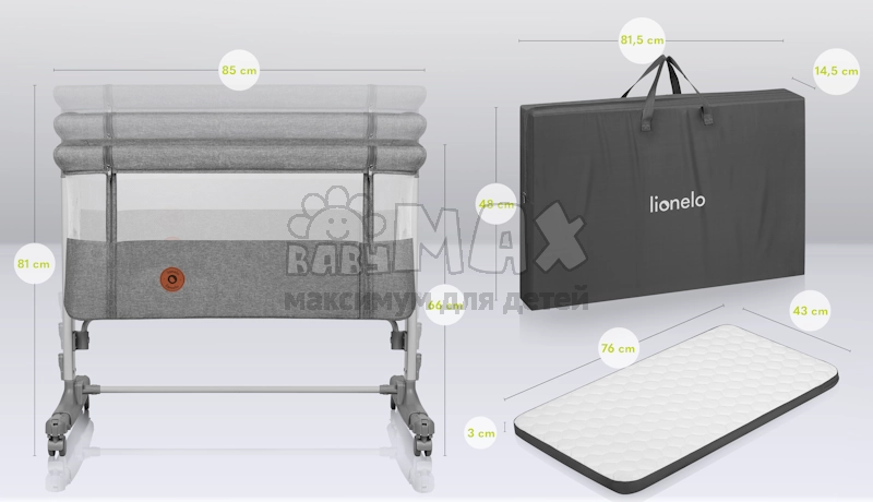 Приставная кроватка Lionelo Aurora Gray Concrete - трансформируемое 3в1 решение для комфортного сна вашего малыша. Благодаря компактному формату модель отлично подходит для размещения в ограниченном пространстве спальни, не занимая много места.