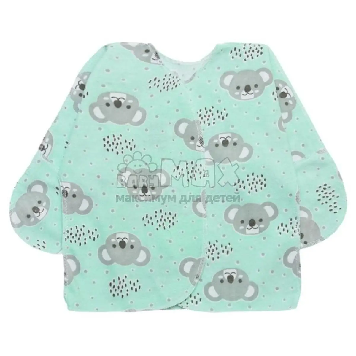 Выполнена распашонка с запахом. Закрывается при помощи кнопки. Длинные ручки дополнены царапками, которые не позволяют ребенку травмироваться. Швы у кофточки - наружные. Коалы, которые украшаю распашонку выглядят очень забавно, и обязательно порадуют малыша.