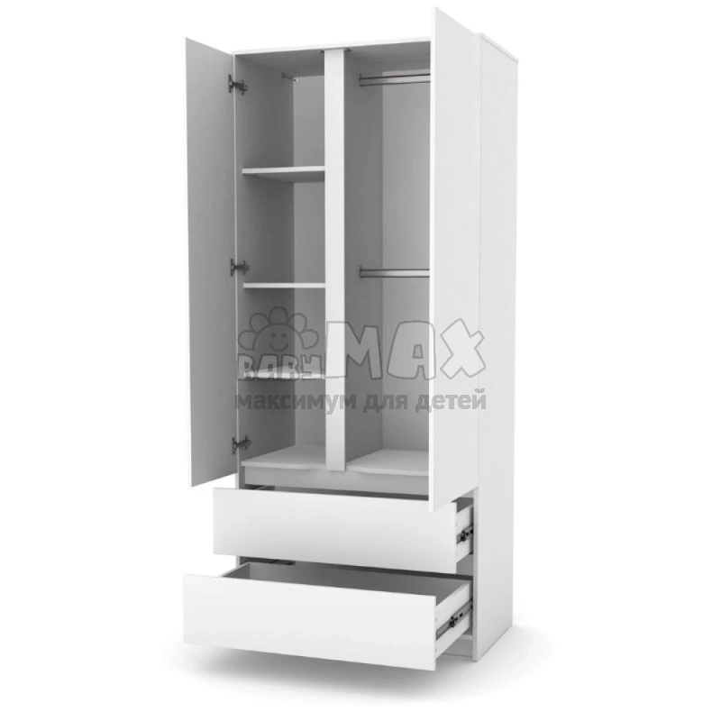 Что бы разместить вещи в шкафе, максимально комфортно, предусмотрены: полочки, ящики и штанга для вешалок. В Вашем распоряжении: