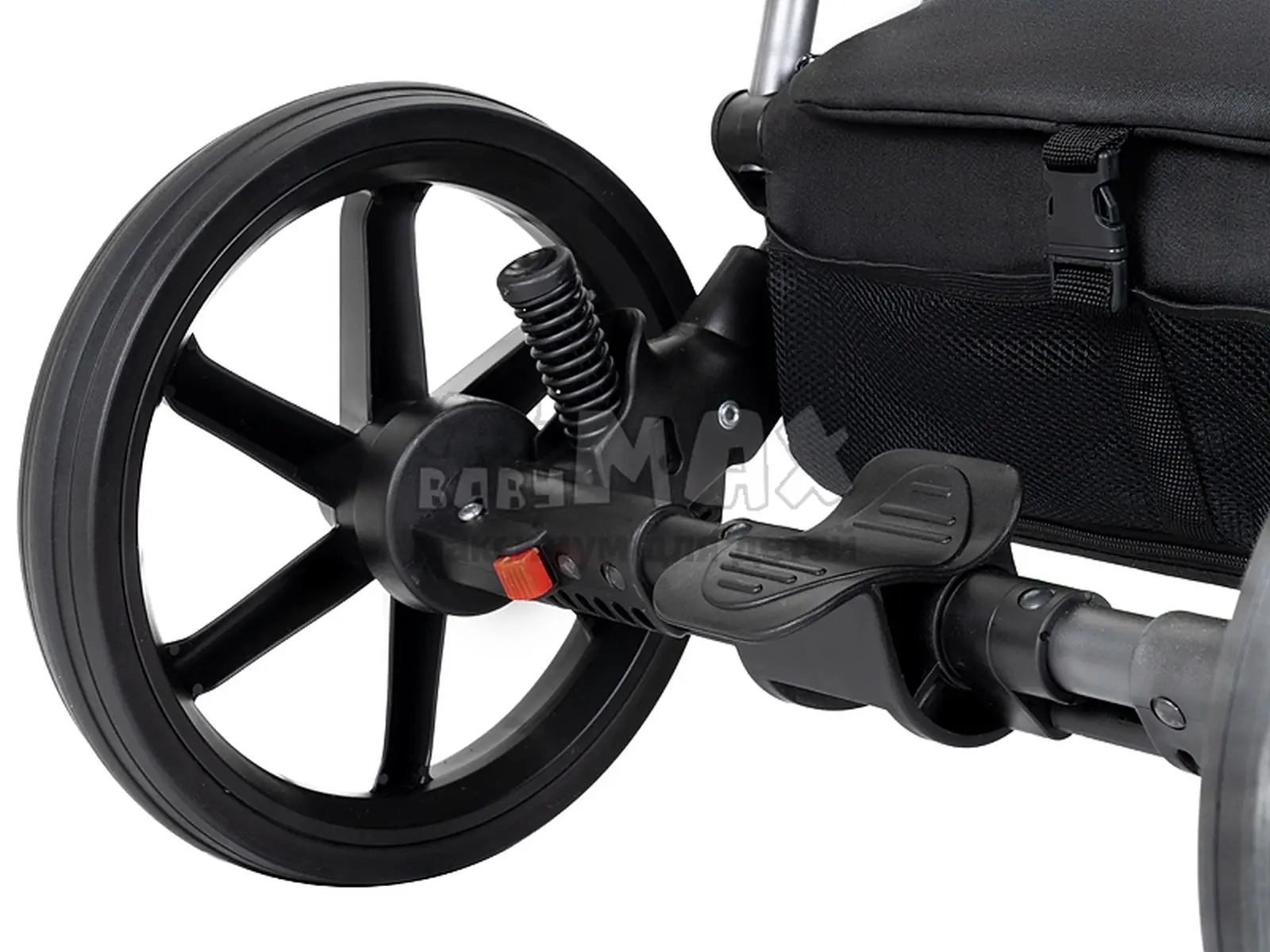 Прочная рама шириной 56 см, станет отличной основой для гелиевых, не пробивных колес. Передние колеса — поворотные, при необходимости фиксируются.  Двойная амортизация, позволит сделать поездку по проблемным участкам дороги более комфортной.