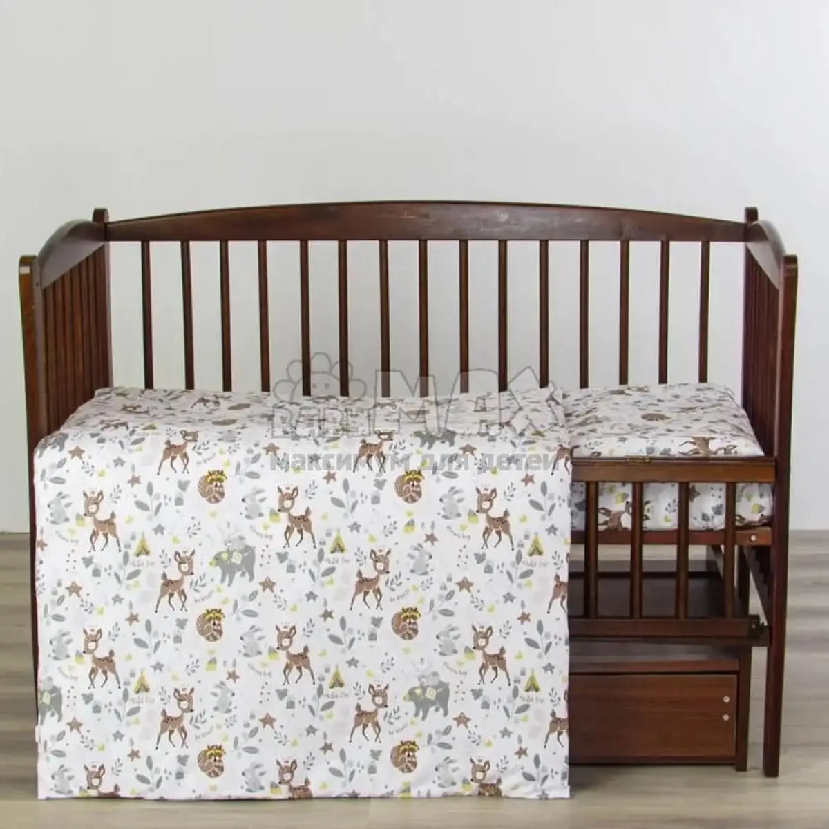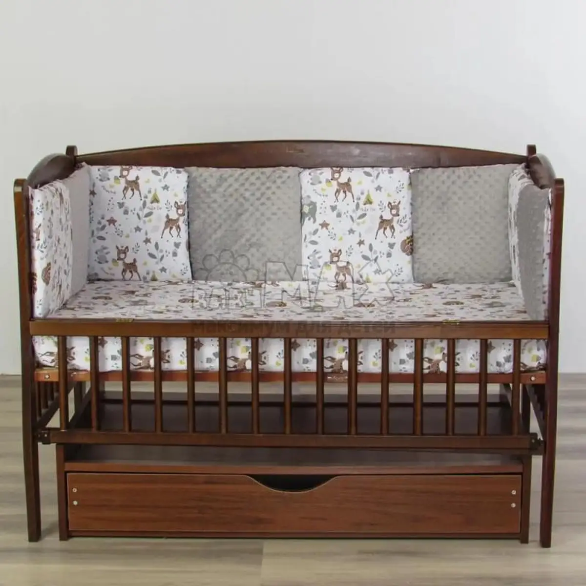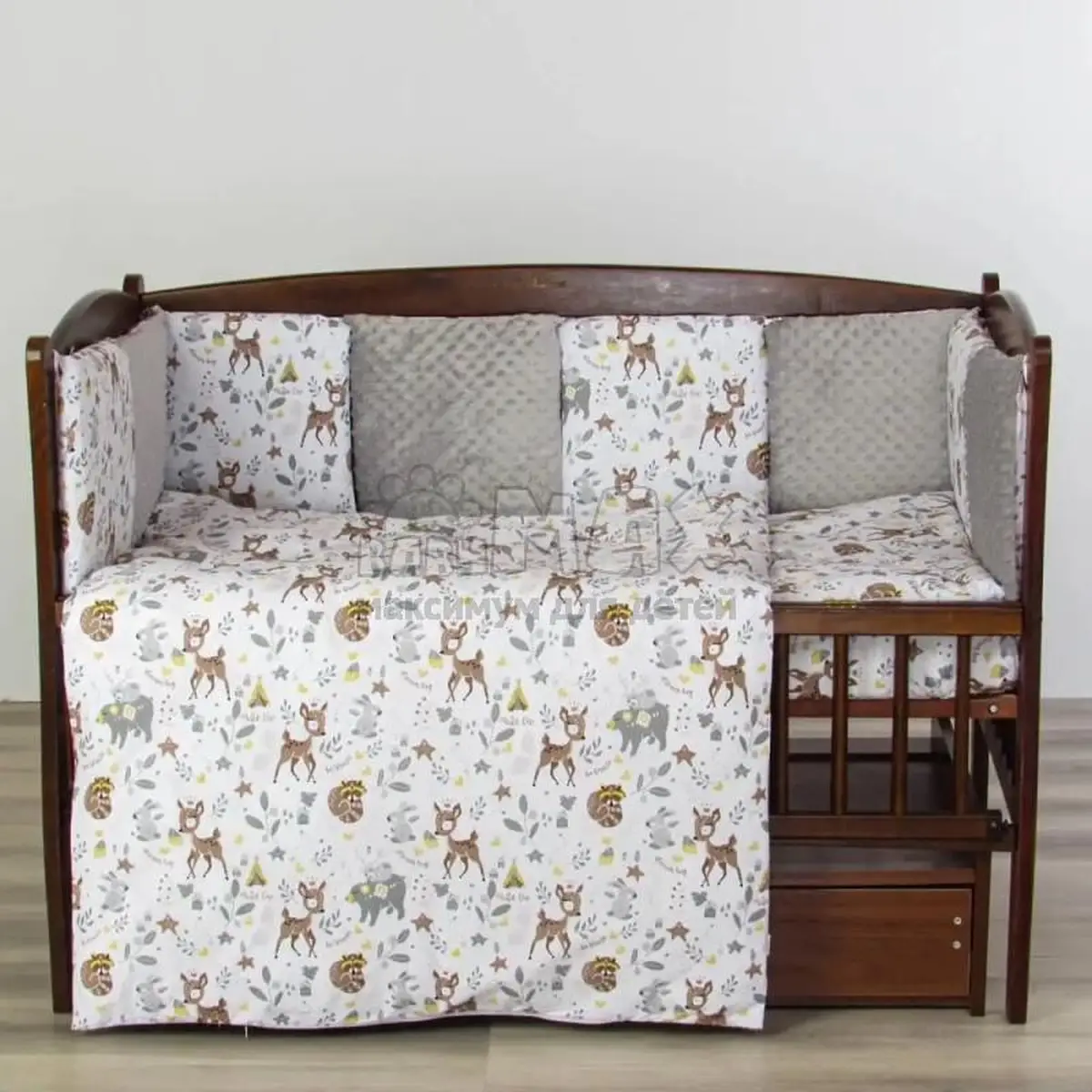 Комплект подойдет для любой кроватки: прямоугольной (120х60 см), овальной и круглой.