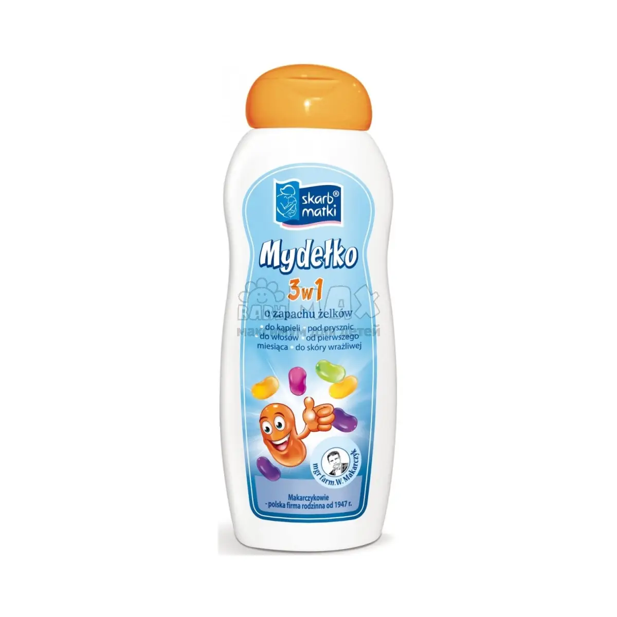 Жидкое мыло 3 в 1 для младенцев и детей Skarb Matki с ароматом желеек, 250 мл — это универсальное средство для уходовой гигиены малышей с первых дней жизни. С его помощью купание превращается в безопасный и приятный ритуал благодаря продуманной 3‑функциональной формуле: мыло сочетает в себе свойства пенки для ванны, шампуня и геля для душа, обеспечивая комплексный уход кожным покровам и волосам ребёнка.