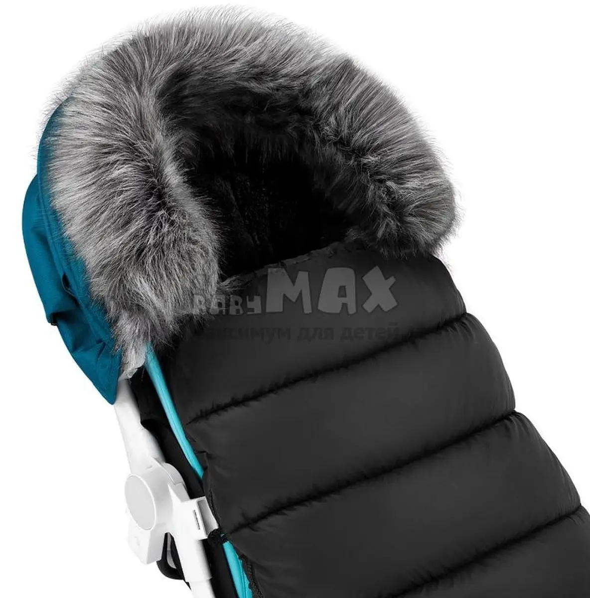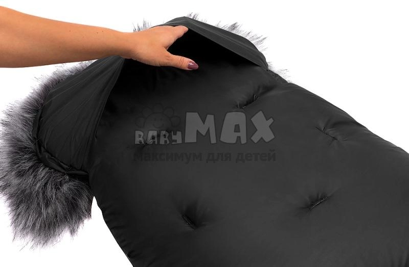 5. Капюшон конверта плотно стягивается для сохранения тепла внутри и отделан съемным мехом.